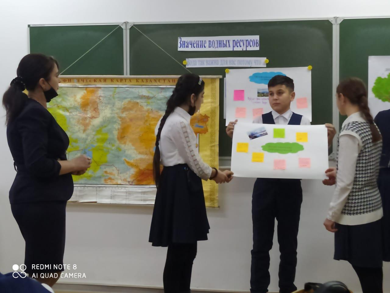 География пәні мұғалімі :Комплешева Татьяна Васильевна 7 «Б» сынып оқушыларымен желтоқсан айының 15 жұлдызында «Значение водных ресурсов» атты ашық сабақ өткізілді. Сабақ барысында жаңартылған білім мазмұны бойынша тапсырмалар берілді. Сабақта тапсырмалар балалардың жас ерекшеліктеріне сай жасалған .Аталған ашық сабақ жоғарғы деңгейде өткізілді.