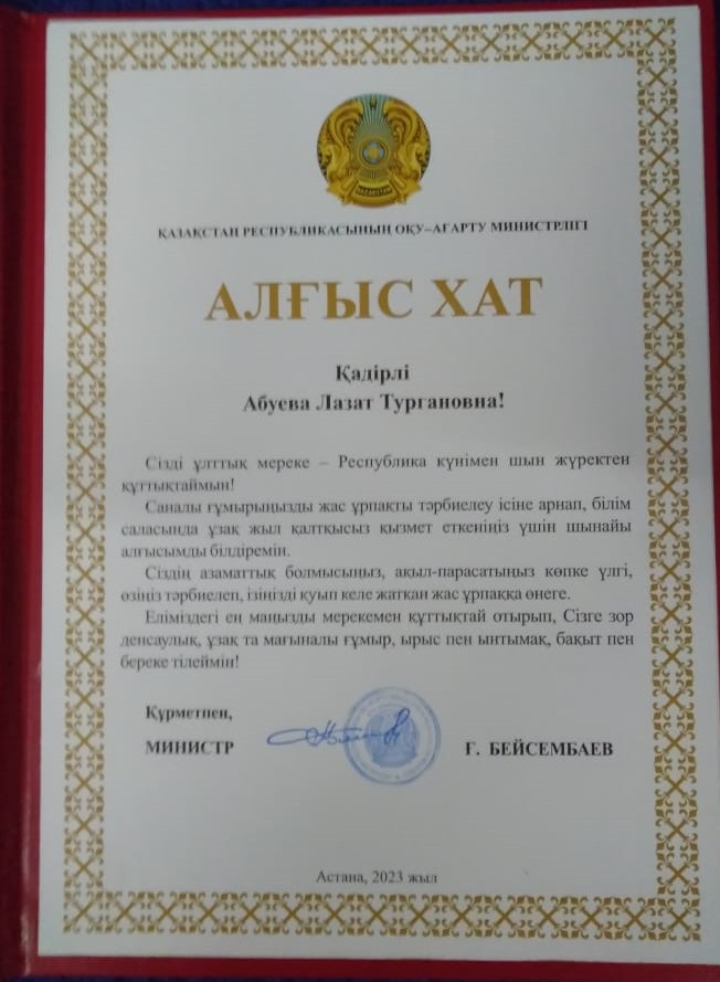 10 ноябрь 2023 0 1 2 3 4 5 Мұғалімдердің жетістіктері Химия пәні мұғалімі Абуева Л.Т. көпжылдық ерен еңбегі үшін ҚР ОҚУ-АҒАРТУ МИНИСТРЛІГІНІҢ министрі Ғ.Бейсембаевтың Алғыс хатымен марапатталды.