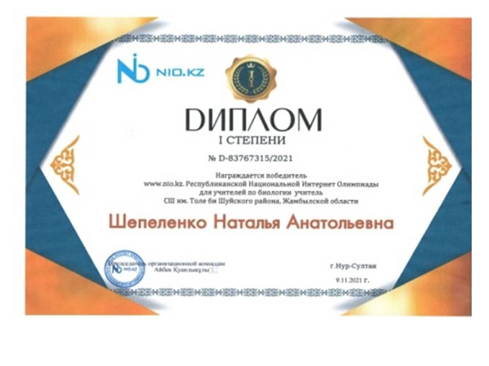 В казахстанской интернет-олимпиаде для учителей, состоявшейся в ноябре, приняла участие учитель биологии Шепеленко Н.А. Награжден Дипломом 1-й степени в республике.