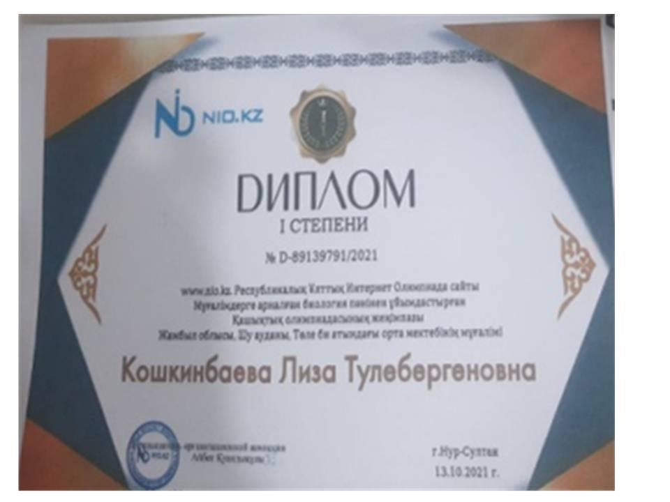 Учитель биологии на Республиканской национальной интернет-олимпиаде для учителей Коскинбаева Л.Т. Награжден Дипломом I степени.