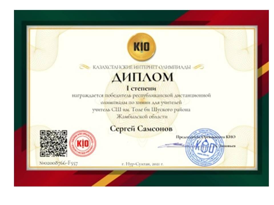 Учитель химии Самсонов принял участие в Казахстанской интернет-олимпиаде для учителей, состоявшейся в октябре . Диплом I степени был вручен в республике.