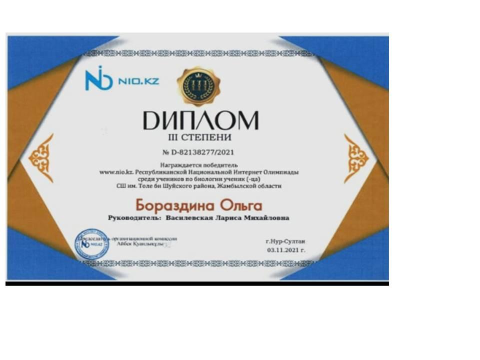 Учитель биологии на Казахстанской интернет-олимпиаде для учителей Васильевской Л.M. Награжден Дипломом 1-й степени в республике.