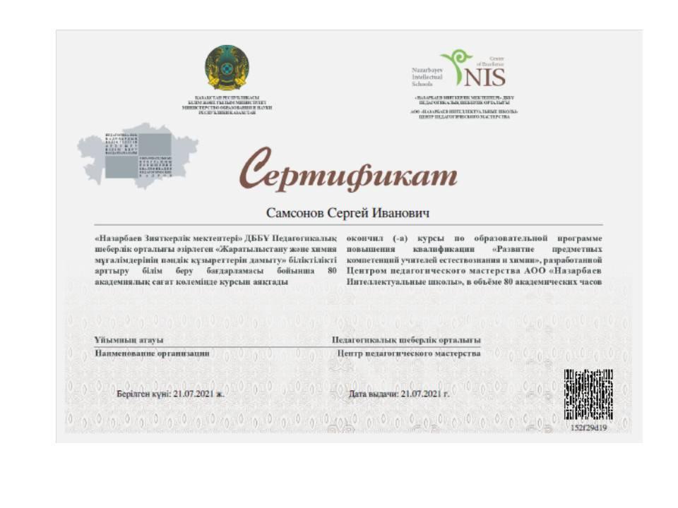 Учитель химии Самсонов С.И. награжден сертификатом в филиале Центра педагогического мастерства в г. Таразе на тему «Развитие предметной компетентности учителей естествознания и химии», разработанный Центром педагогического мастерства АОО «Назарбаев Интеллектуальные школы».