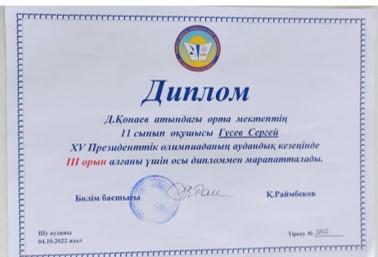 Оқушылар арасындағы өткізілген жалпы білім беретін пәндер бойынша XV Президенттік олимпиаданың аудандық кезеңіне дайындап қатыстырған 11 «б» сынып оқушысы Гусев Сергей жүлделі ІІІ Дәрежелі Дипломмен марапатталды.