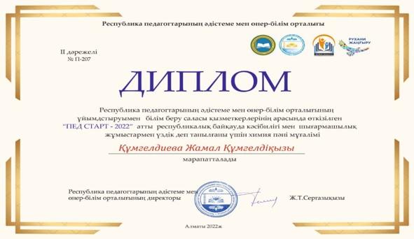 «Педстарт-22» Республикалық педагогтарының әдістеме мен өнер-білім орталығының ұйымдастыруымен өткізілген байқауда «кәсібилігі мен шығармашылық жұмыстармен үздік деп танылғаны үшін» ІІ дәрежелі Дипломмен марапатталды.