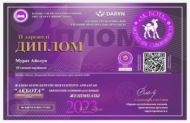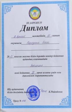 «Darin.onlin» платформасының ұйымдастыруымен өткізілген олимпиадаға қатысып, І Дәрежелі Дипломмен марапатталды.