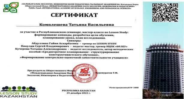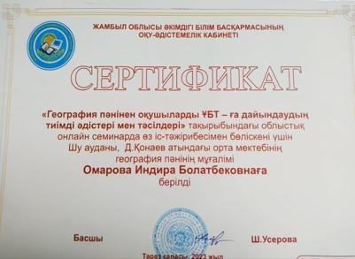 «География пәнінен оқушыларды ҰБТ-ға дайындаудың тиімді әдіс-тәсілдері» тақырыбында онлайн семинарда өз тәжірибесімен бөліскен үшін Серификатпен марапатталды.
