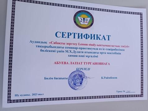 Өз білімін жетілдіру мақсатымен «Өрлеу» БАО АҚ ұйымдастырған «Химия пәні мұғалімдерінің пәндік құзыреттіліктерін дамыту. 7-9 сыныптардың қиын тақырыптары» тақырыбында өткізілген курсқа қатысып, Сертификатын алды.
