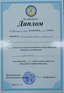 Оқушылар арасындағы өткізілген жалпы білім беретін пәндер бойынша аудандық олимпиадаға дайындап қатыстырған 10«а» сынып оқушысы Жаңбырбай Лазира жүлделі ІІІ орынды иеленіп Дипломмен марапатталды жетекшісі – пән мұғалімі Құмгелдиева Ж.Қ.