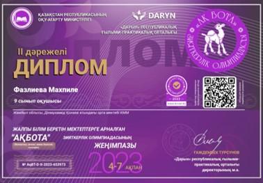 Оқушыларға арналған «Дарын» Республикалық ғылыми-практикалық орталығы ұйымдастырған «Ақбота» олимпиаданың I дәрежелі дипломымен 9 «а» сынып оқушысы Бақберген Толғанай марапатталды, жетекшісі – пән мұғалімі Құмгелдиева Ж.Қ.