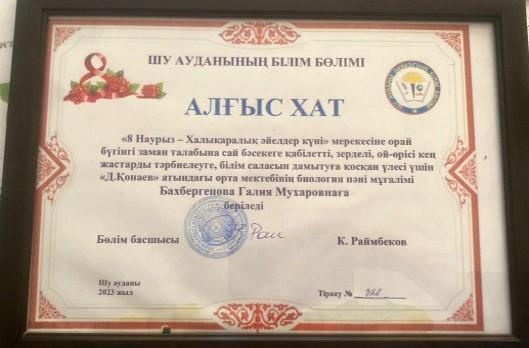 Шу ауданы білім бөлімінің Алғыс хатымен марапатталды.