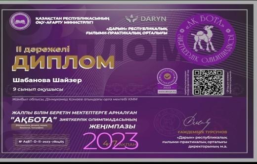 Оқушыларға арналған «Дарын» Республикалық ғылыми-практикалық орталығы ұйымдастырған «Ақбота» олимпиаданың IІ дәрежелі Дипломымен 9«д» сынып оқушылары Фазлиева Махпиле, Шабанова Шайзер, 7«г» сынып оқушысы Уалиханов Санжар марапатталды, жетекшісі – пән мұғалімі Шепеленко Н.А.