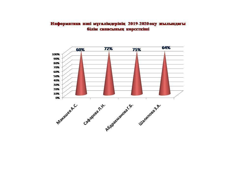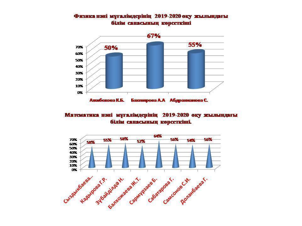 Осы жоғарыда айтылған мемлекеттік стандарт талаптарын тексеру жұмыстары жүргізілді Математика, физика және информатика пән бірлестігінде барлығы 15 мұғалім жұмыс атқарады , 5 мұғалім жоғары санатты, 2 мұғалім – бірінші санатты, 4 мұғалім - ІІ санатты, 4 мұғалімде санаты жоқ .