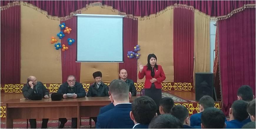 Түрік мәдени орталығының өкілі – И. Гамидов ата-бабаларымыздың бейбітшілікке жету жолындағы ерліктері туралы айтып, үлкен кісілердің, ақсақалдардың ақыл кеңестеріне құлақ түру қажеттілігін ескертті. Қонаев ауылының көпұлтты және тату елді- мекені екендігін алға тарта отырып, мектеп оқушыларының бойында имандылық, тәртіп, адамгершілік қасиеттерінің басымдылығына сенетінін жеткізді.