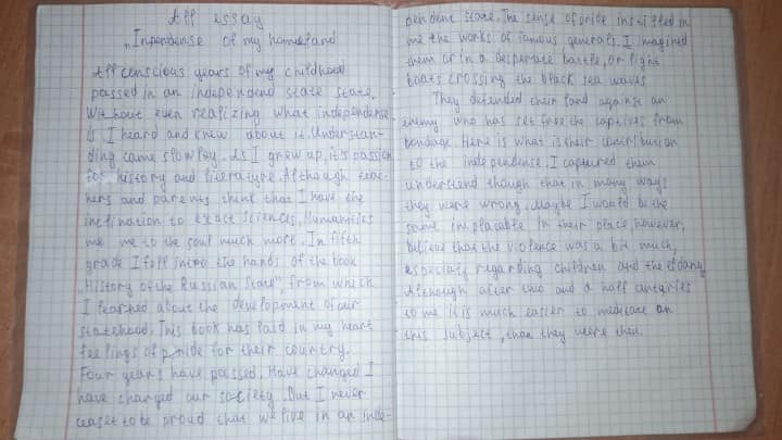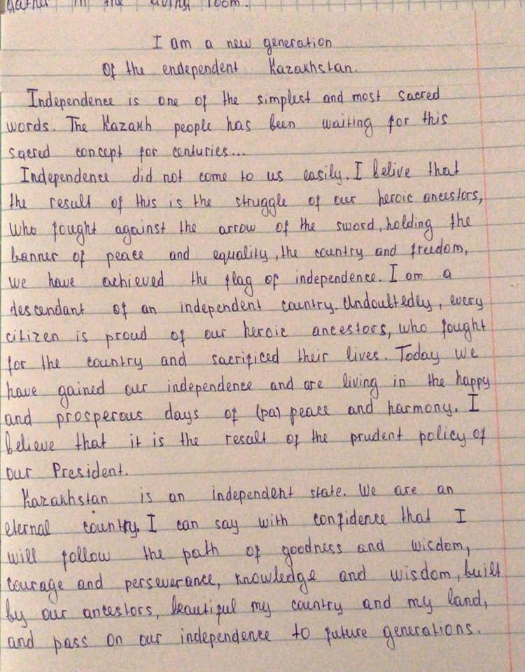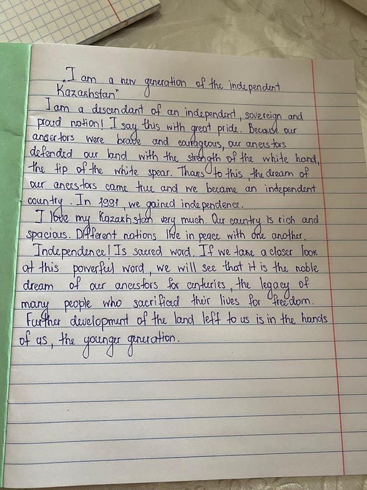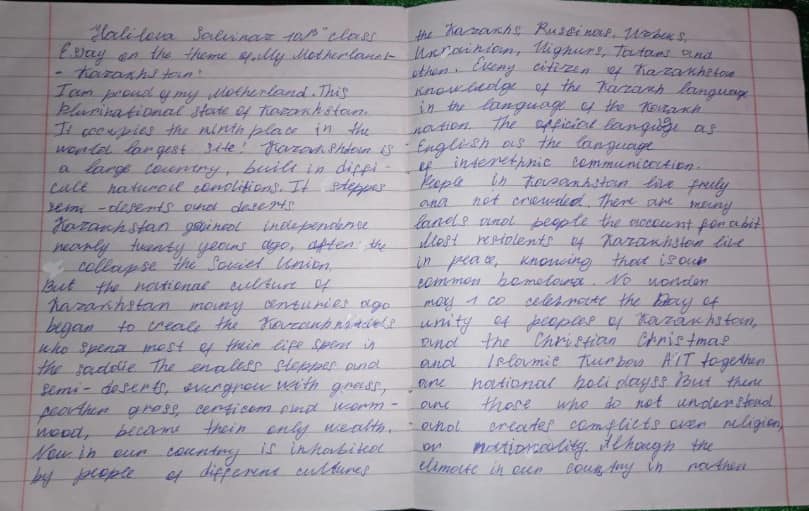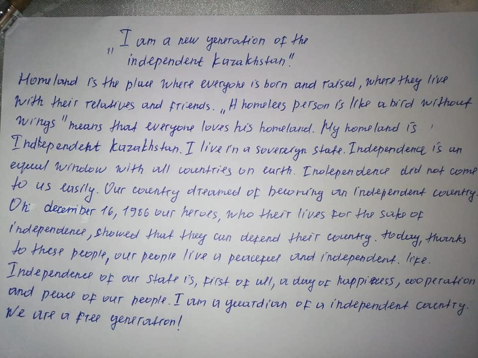 Жамбыл облысында Дүниежүзілік балаларды қорғау күнін мерекелеуге арналған «Бала құқығы-адам құқығы» атты іс шаралар жоспарына сәйкес 06.11.2020 жылы ағылшын тілі бірлестігінің жетекшісі А.Рашидованың ұйымдастыруымен 10-11 сынып оқушылары арасында "Generation of an independent country" тақырыбында үздік эссе байқауы өткізілді.