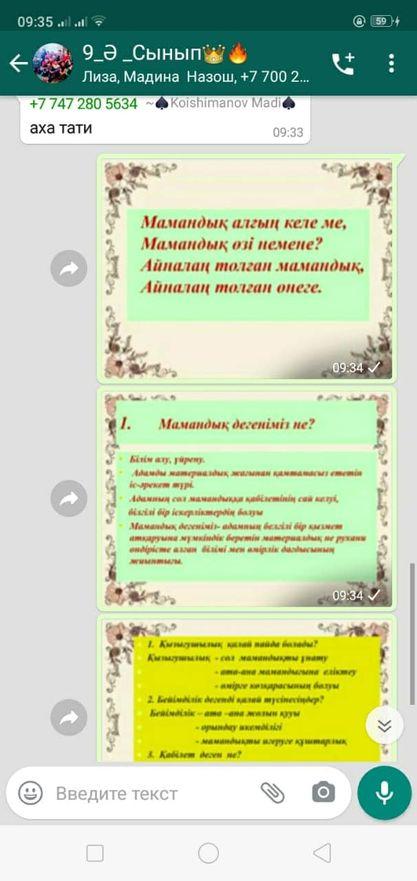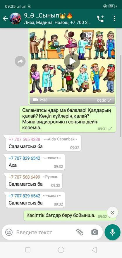 Төле би атындағы орта мектебінің психологы Г.М.Дихамбаеваның ұйымдастыруымен WhatsApp желісі арқылы Кәсіптік бағдар беру жұмысы бойынша  9 сынып оқушыларының чатына "Кәсіп таңдау" тақырыбында видиоролик жіберіліп, кеңестер берілді.