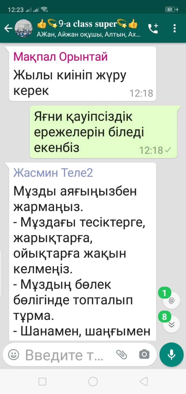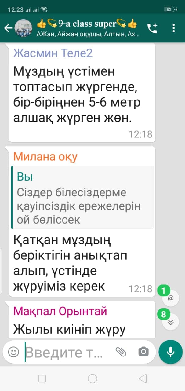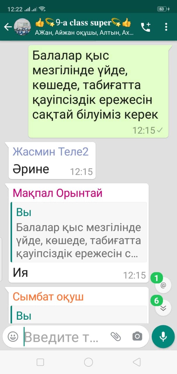 Төле би атындағы орта мектебінде ДҚТІЖО А.Д.Джуаспаеваның ұйымдастыруымен барлық сыныптарда онлайн форматта Whats App желісі арқылы "ҚЫС МЕЗГІЛІНДЕГІ ҚАУІПСІЗДІК ЕРЕЖЕЛЕРІ" тақырыбында сынып сағаттары өткізілді. Мақсаты - балалардың қыс мезгілінде үйде, көшеде, табиғатта қауіпсіздік ережесін сақтай білуге, өз қауіпсіздігіне жауапкершілікпен қарауға, қауіпсіздік ережелерін сақтауға тәрбиелеу.