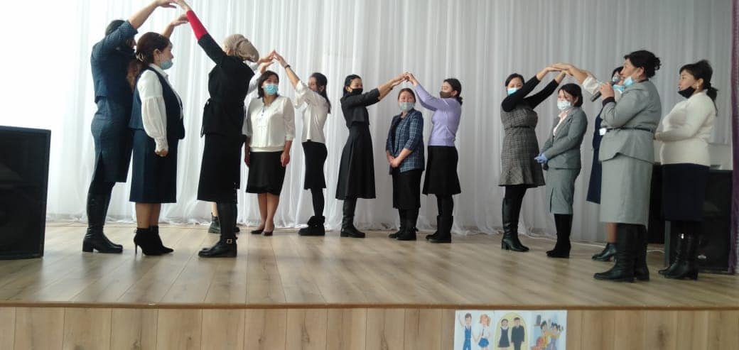 Әрі қарай, келген қонақтарға көтеріңкі көңіл сыйлау мақсатында, мектептің психологтары Е.Турыскулова және Г.Диханбаева «Шатыр адам» атты тренингпен семинарды жалғастырды.