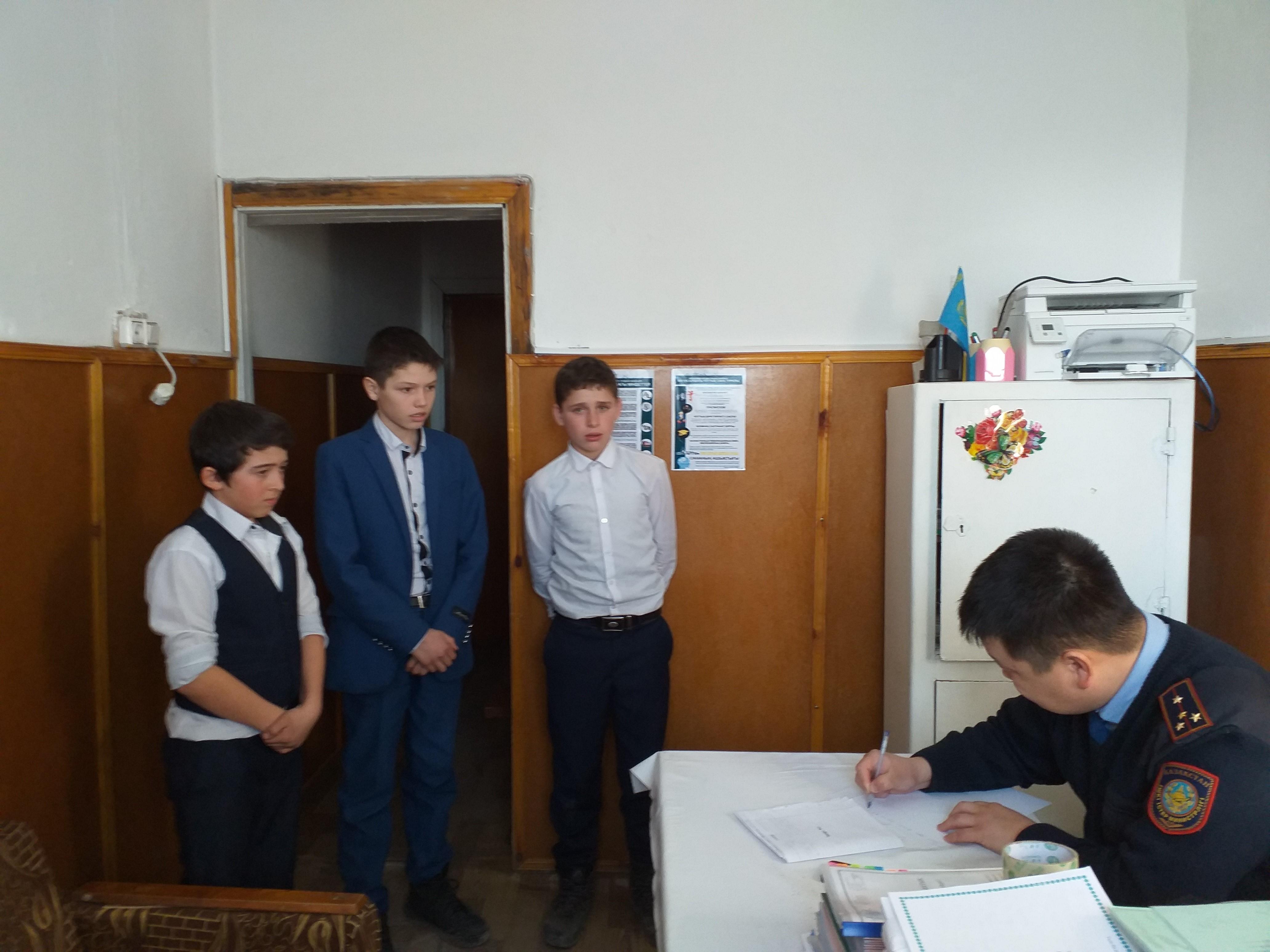 ЮПБ инспекторы Н.Орақатов «Ер балаға тән мінез» тақырыбында 6-7 сынып оқушыларымен әңгіме жүргізіп, мектептің тәртібін бұзатын оқушыларымен жеке жұмыс жүргізді.