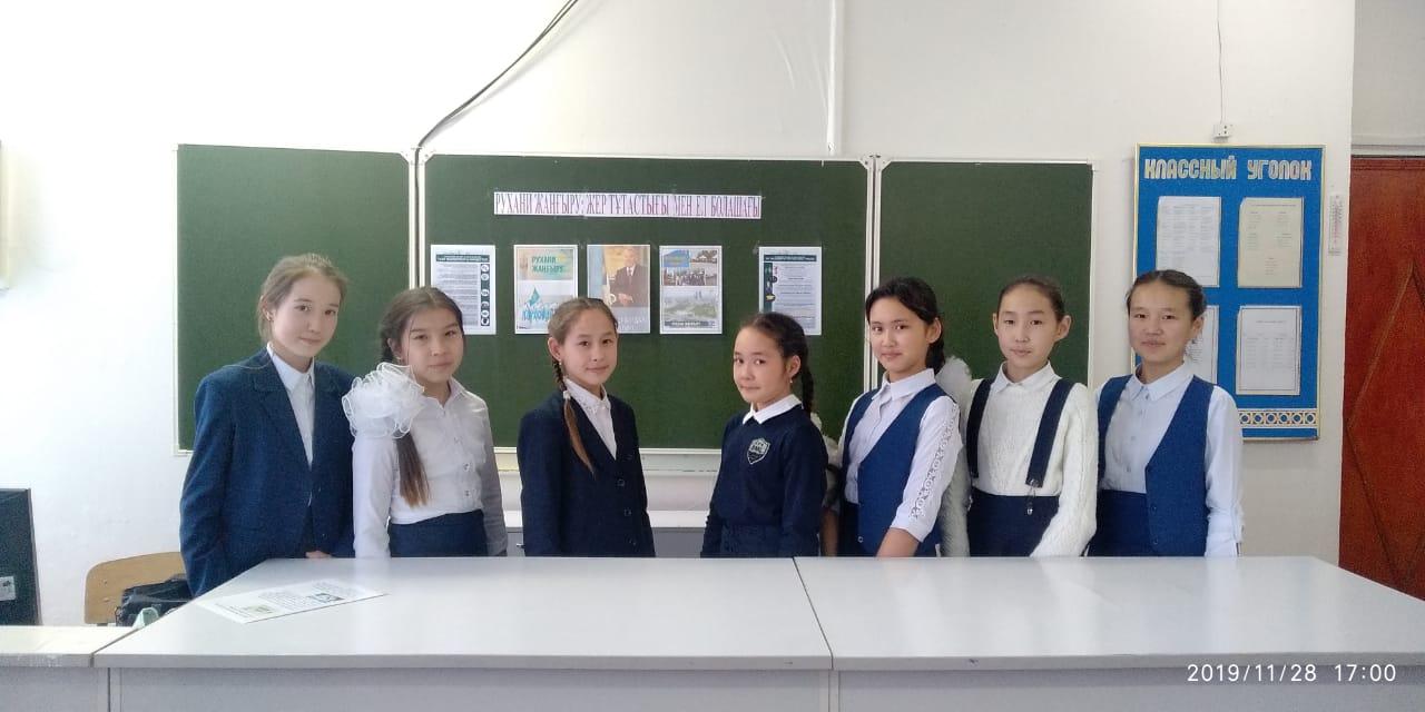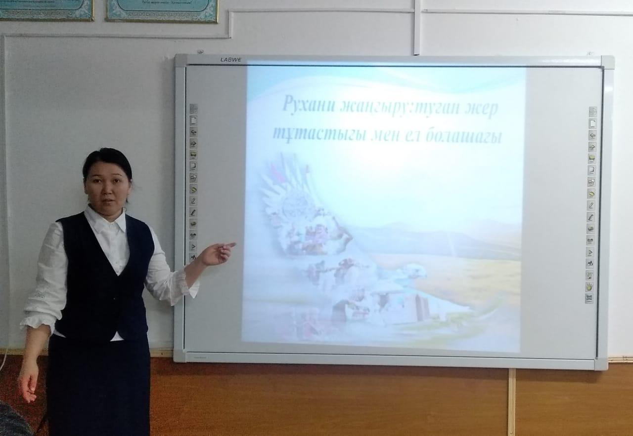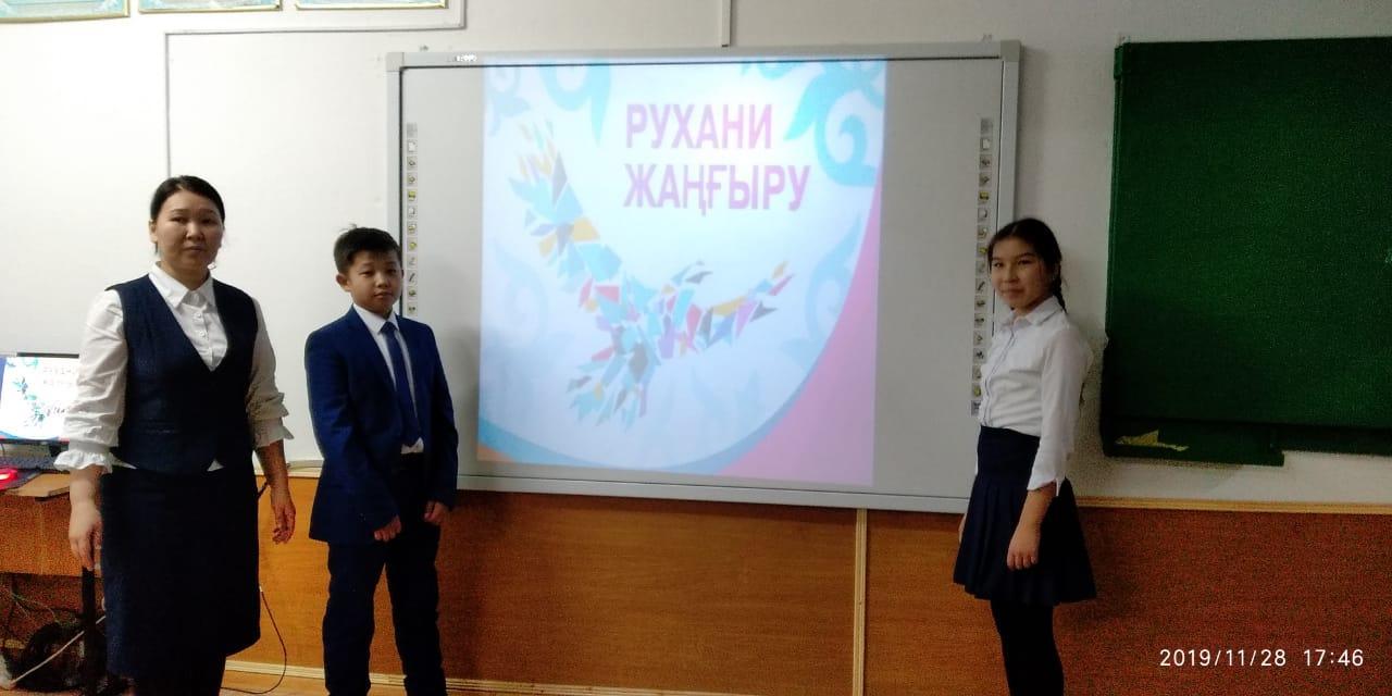 Мектебімізде желтоқсан айында 7 "а" сынып оқушылары сынып жетекшілерінің ұйымдастыруымен жоспар бойынша "Болашаққа бағдар: рухани жаңғыру" мақаласы аясында "Рухани жаңғырудың жарқын жолы" тақырыбында сынып сағатын өткізді. Мақсаты: рухани құндылықтарды сипаттау, ой санамызды, болашаққа деген көзқарасымызды дәріптеу.