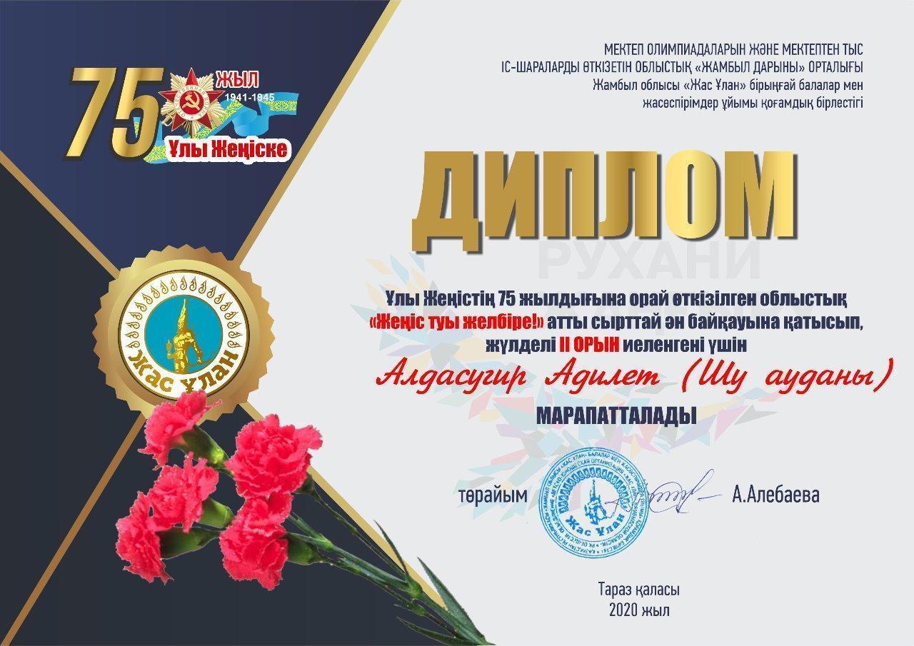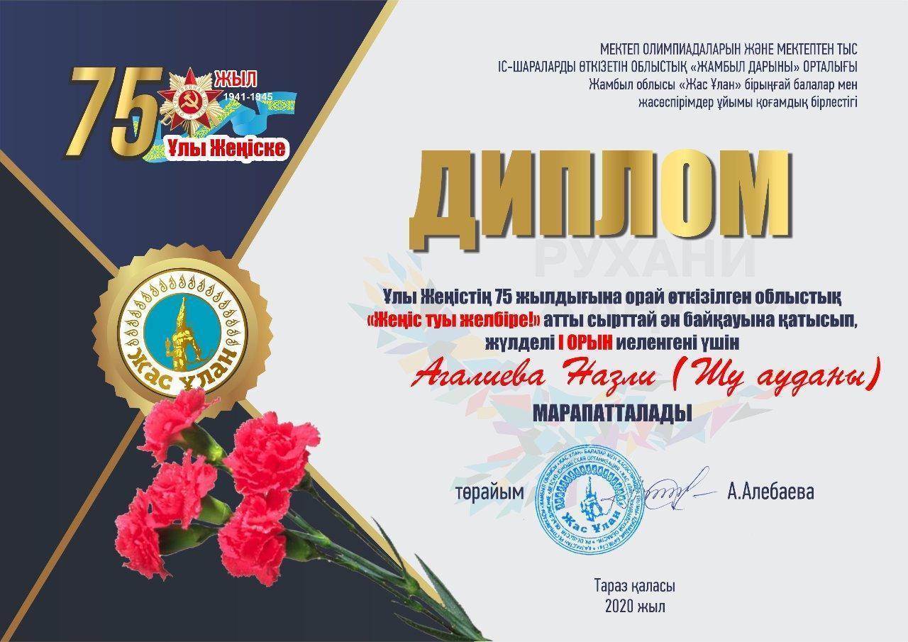 Ұлы Жеңістің 75 жылдығына орай өткізілген облыстық "Жеңіс туы желбіре" атты сырттай ән байқауына қатысып, жүлделі I - орын иеленгені үшін 4 "в" сынып оқушысы Агалиева Назли және жүлделі II орын иеленгені үшін 4 "а" сынып оқушысы Алдасүгір Адилет Дипломдармен марапатталды.