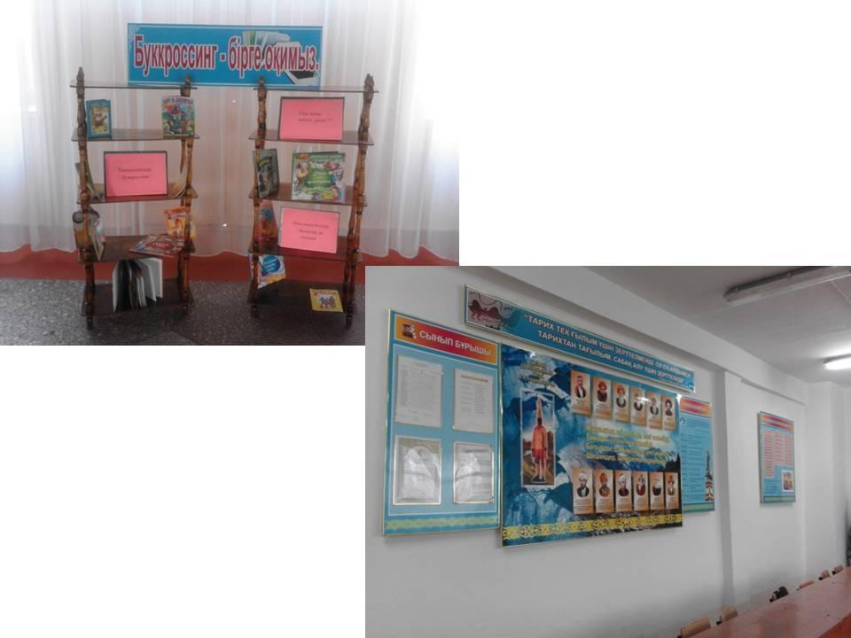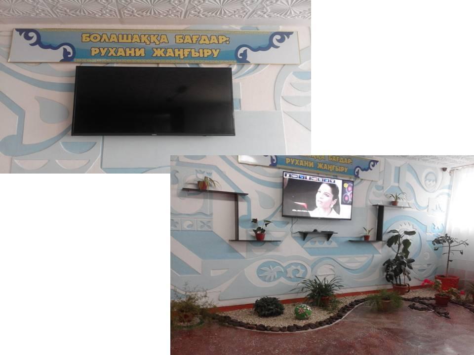 2-қабатта «Болашаққа бағдар; рухани жаңғыру» тақырыбында стенді ілінді. Мектеп мәжіліс залында «XXI ғасыр көшбасшысы-білімді жастар» тақырыбында баннер ілінді. Кітапханада бұрыштар қойылды және оқушылар барып кітаптар оқып отырады. Әр сынып бөлмелерінде сынып бұрыштары стенттер ілінді.