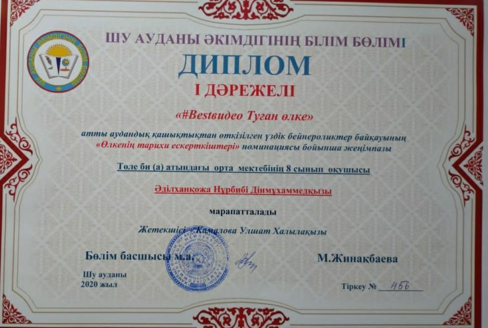 «#Bestвидео Туған өлке» атты аудандық қашықтықтан өткізілген үздік бейнероликтер байқауына Д.Қонаев ауылы Төле би атындағы орта мектебінің 8"А" сынып оқушысы Əділханқожа Нұрбибі Дінмұхаммедқызы "Өлкенің тарихи ескерткіштері" номинациясы бойынша топ жарып, І дәрежелі дипломмен марапатталып, облыстық кезеңге жолдама алды. Жетекшісі: У.Х.Камалова.