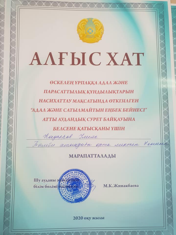 Өскелең ұрпаққа адал және парасаттвлық құндылықтарын насихаттау мақсатында өткізілген "Адал және сатылмайтын еңбек бейнесі" атты аудандық сурет байқауының  жүлделі ІІ  орын иегері 7 сынып оқушысы Мавлюдов Сураддин және жүлделі ІІІ орынның иегері 7 сынып оқушысы Цой Анастасия. 7 сынып оқушылары Бакеева Жания, Оспанбекова Динара, Кадыров Ильяс байқауға белсене қатысқаны үшін алғыс хаттармен марапатталды.