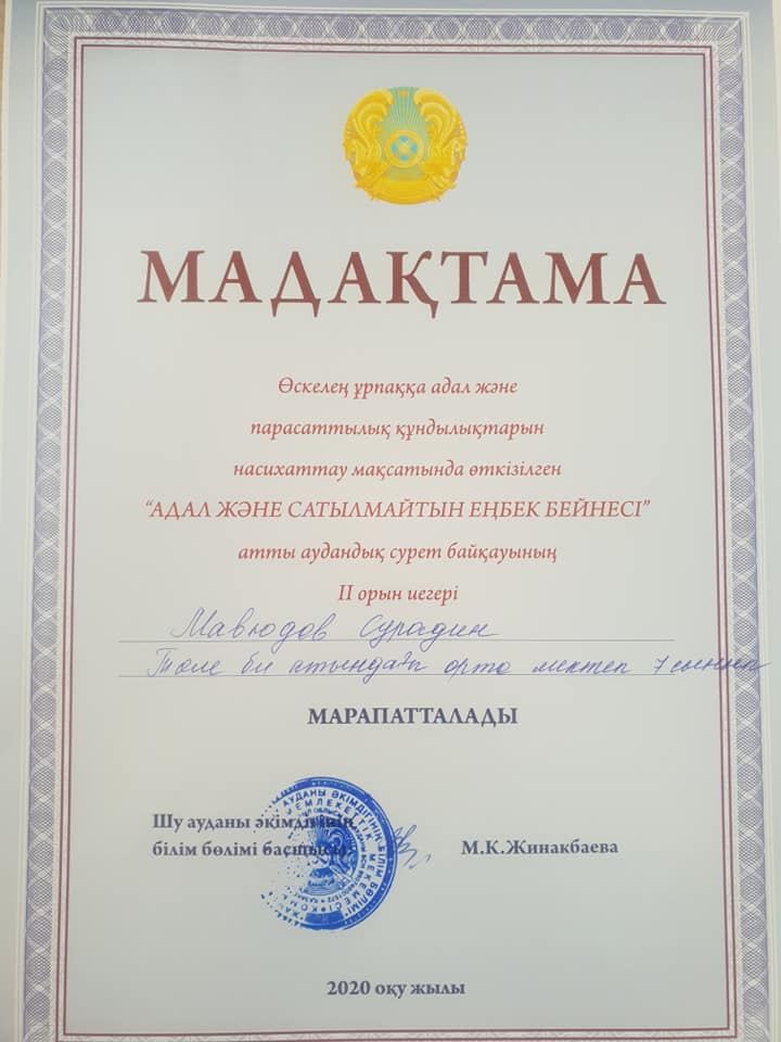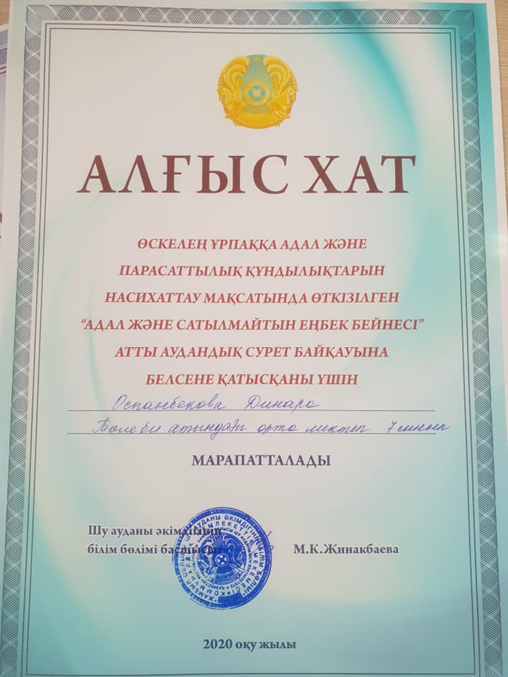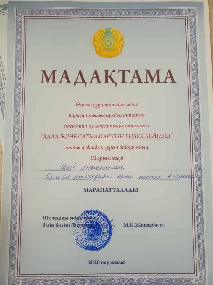 2020 жылдың 6-26 қараша аралығында "Жамбыл адалдық алаңы" жобалық офисі мен «Жастардың әлеуметтік және тұрақты даму қоры» қоғамдық қоры республикалық «Адал еңбектің жарқын бейнесі» жас суретшілер байқауы ұйымдастырылды.Өскелең ұрпаққа адал және парасаттвлық құндылықтарын насихаттау мақсатында өткізілген "Адал және сатылмайтын еңбек бейнесі" атты аудандық сурет байқауының жүлделі ІІ орын иегері 7 сынып оқушысы Мавлюдов Сураддин және жүлделі ІІІ орынның иегері 7 сынып оқушысы Цой Анастасия. 7 сынып оқушылары Бакеева Жания, Оспанбекова Динара, Кадыров Ильяс байқауға белсене қатысқаны үшін алғыс хаттармен марапатталды.