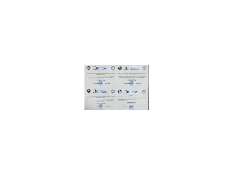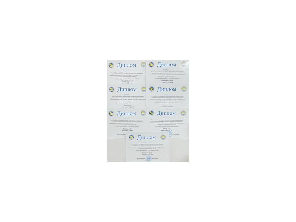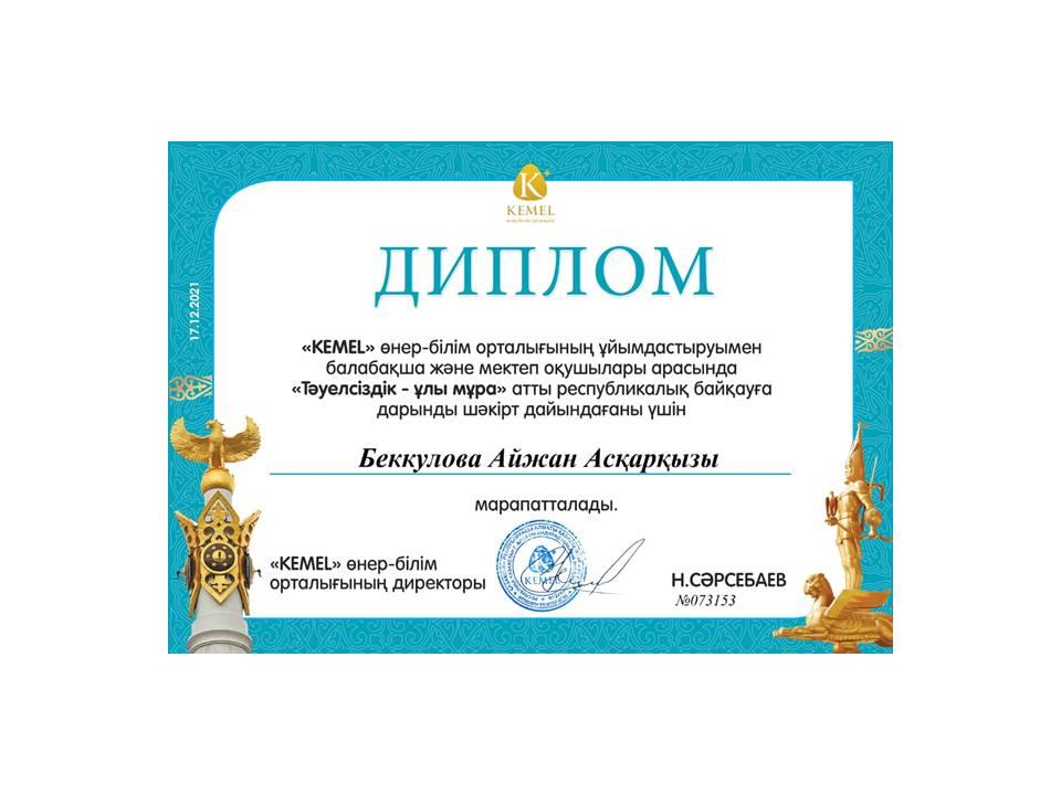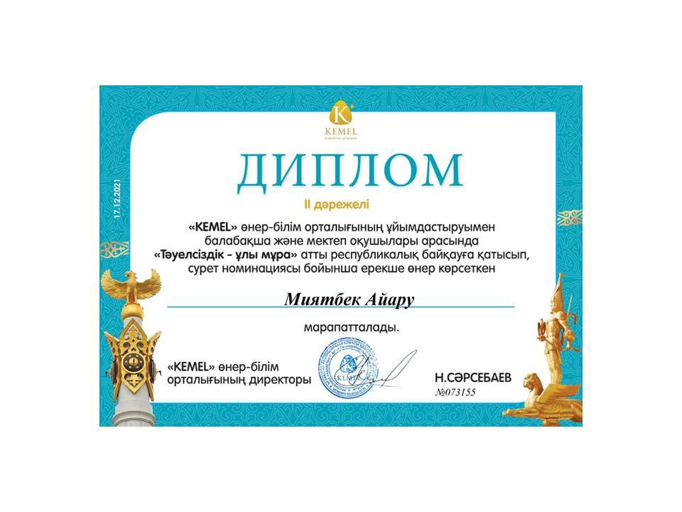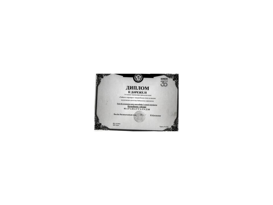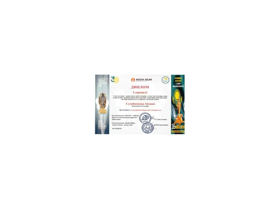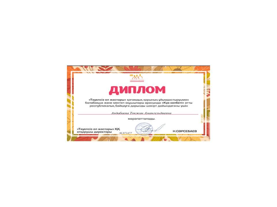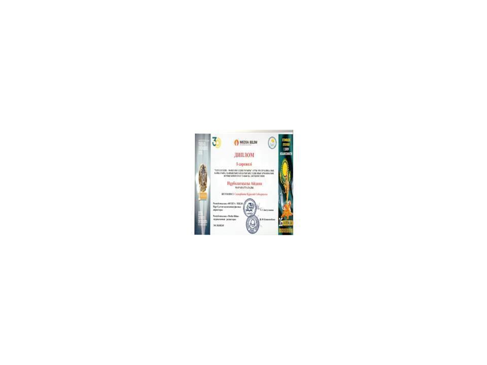 «Тәуелсіздік- мәңгілік елдің тұғыры» атты республикалық байқауына қашықтықтан қатысып, үздік шығармашылық жұмысымен озат табысқа жеткені үшін І дәрежелі дипломмен Нұрболатқызы Айдана, Сулейменова Айдана марапатталды.
