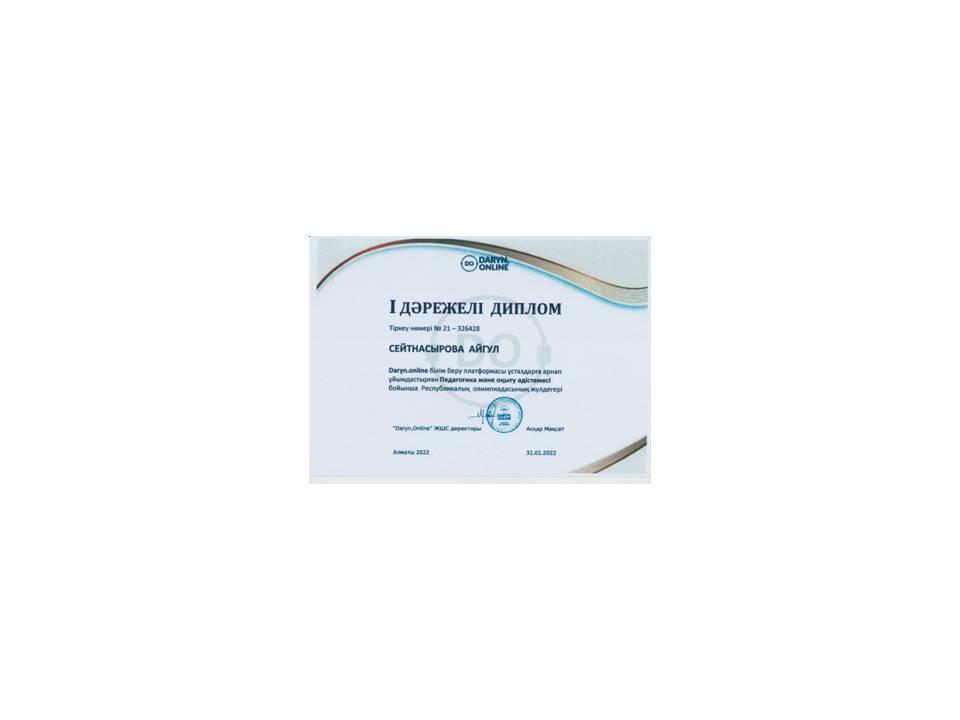 2021 жылы - Daryn.online білім беру платформасы мен Qaztest.kz олимпиада сайты бірлесіп бастауыш сынып мұғалімдері арасында ұйымдастырылған республикалық олимпиаданың Математика пәні бойынша ІІІ дәрежелі дипломмен марапатталады