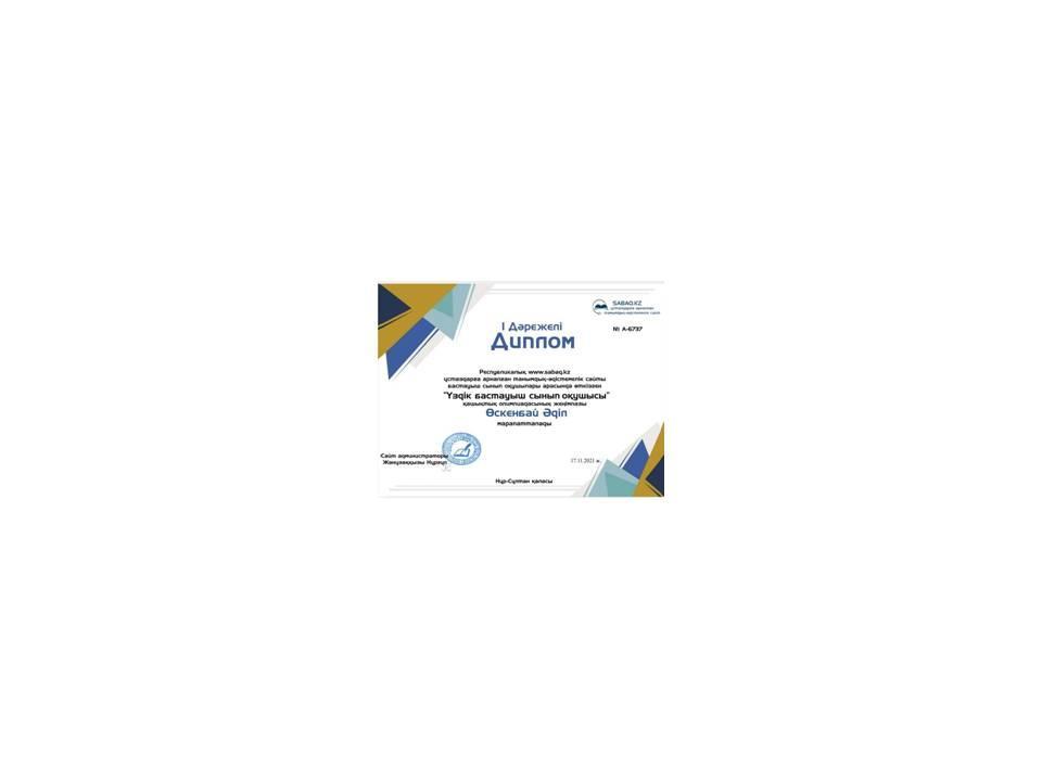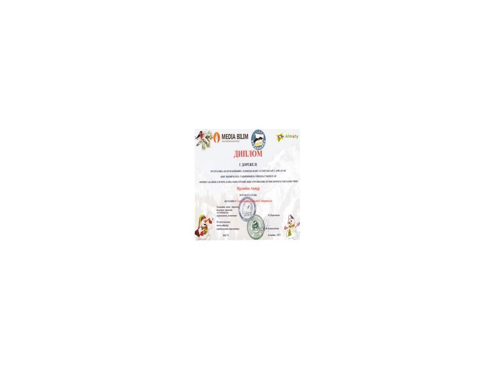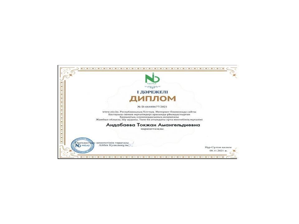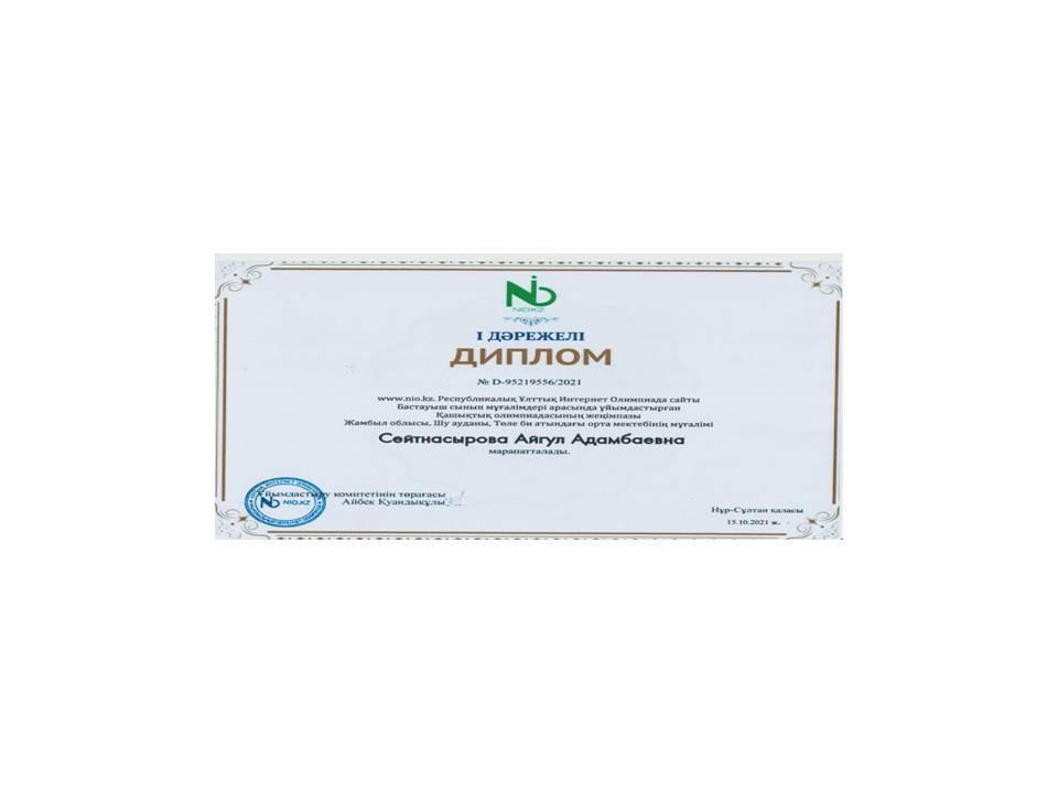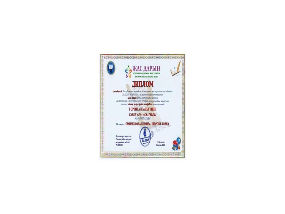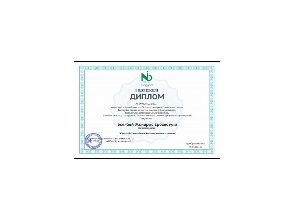 2021 жылы www.nio.kz Республикалық Ұлттық Интернет Олимпиада сайты Бастауыш сынып қазақ тілі пәнінен ұйымдастырған қашықтық олимпиадасының жеңімпазы Баянбай Жанарыс Ерболатұлы марапатталды.