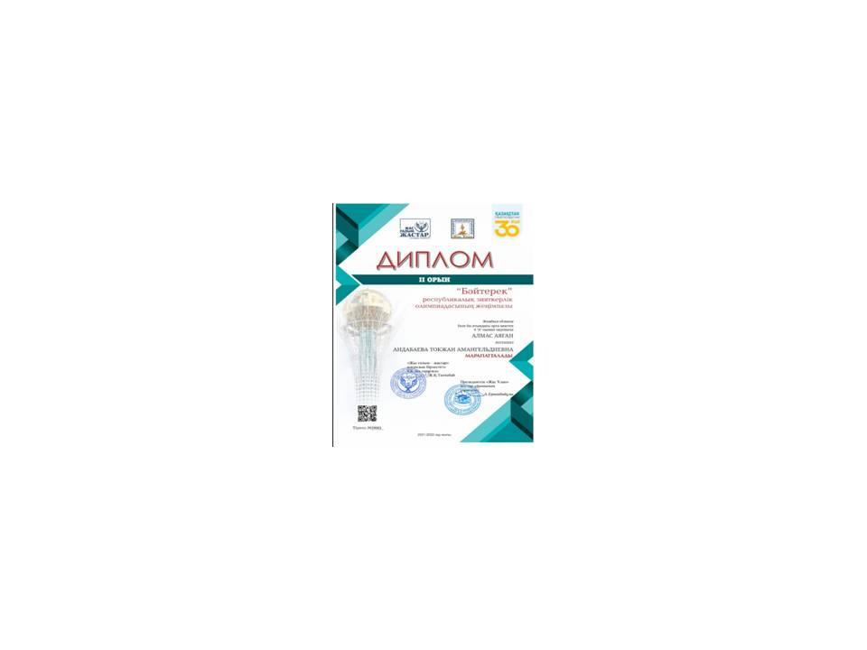 2021-2022 оқу жылы «Бәйтерек» республикалық зияткерлік олимпиадасының жеңімпазы Алмас Аяған жүлделі ІІ орын дипломымен марапатталды.