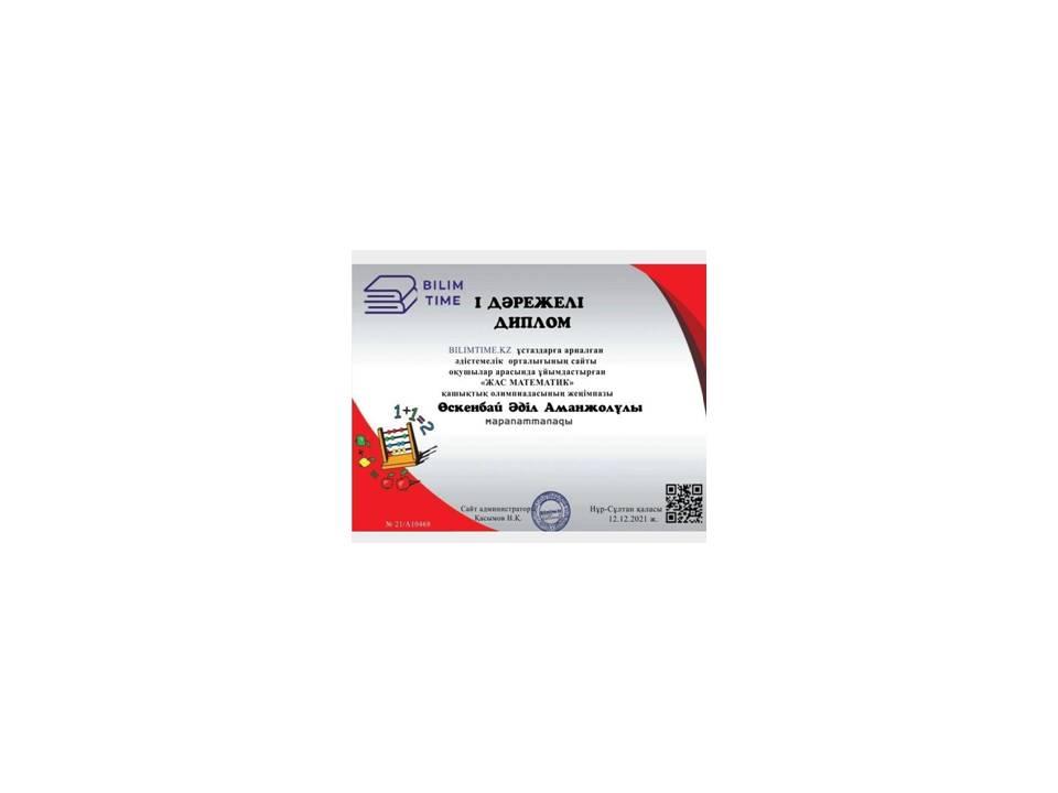 2021 жылы Bilimtime.kz «Жас математик» қашықтық олимпиада жеңімпазы Өскенбай Әділ.