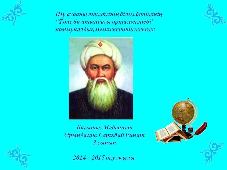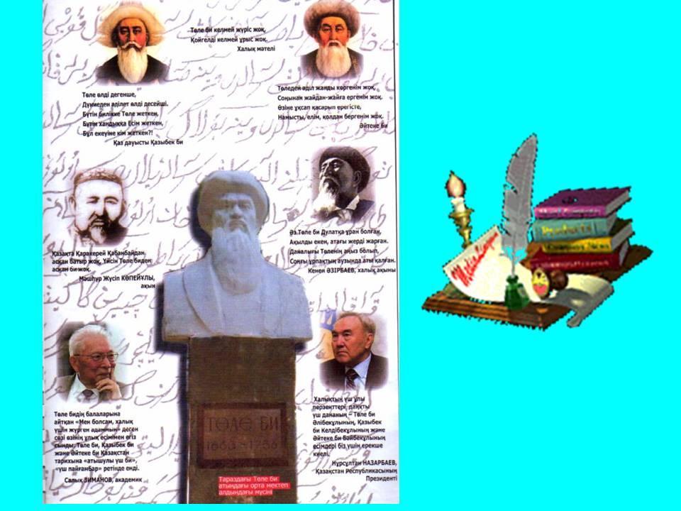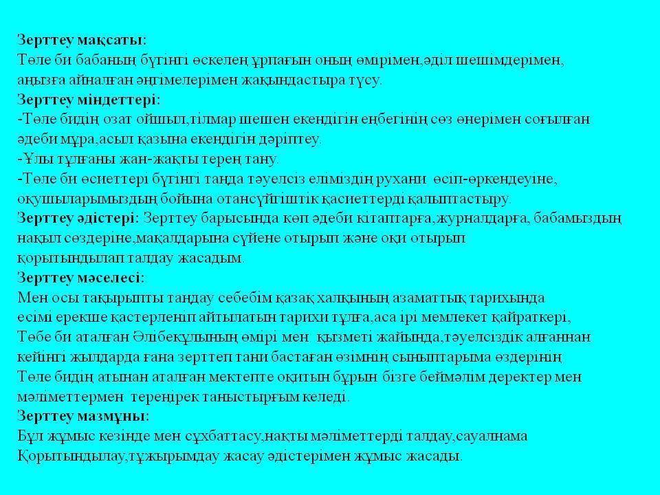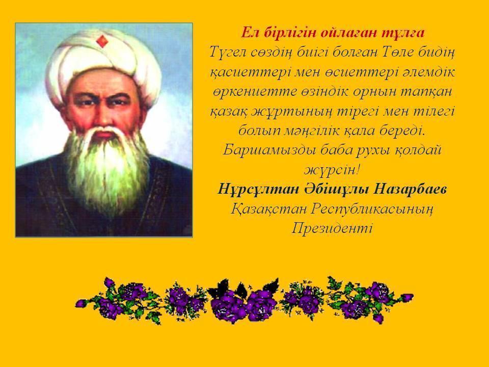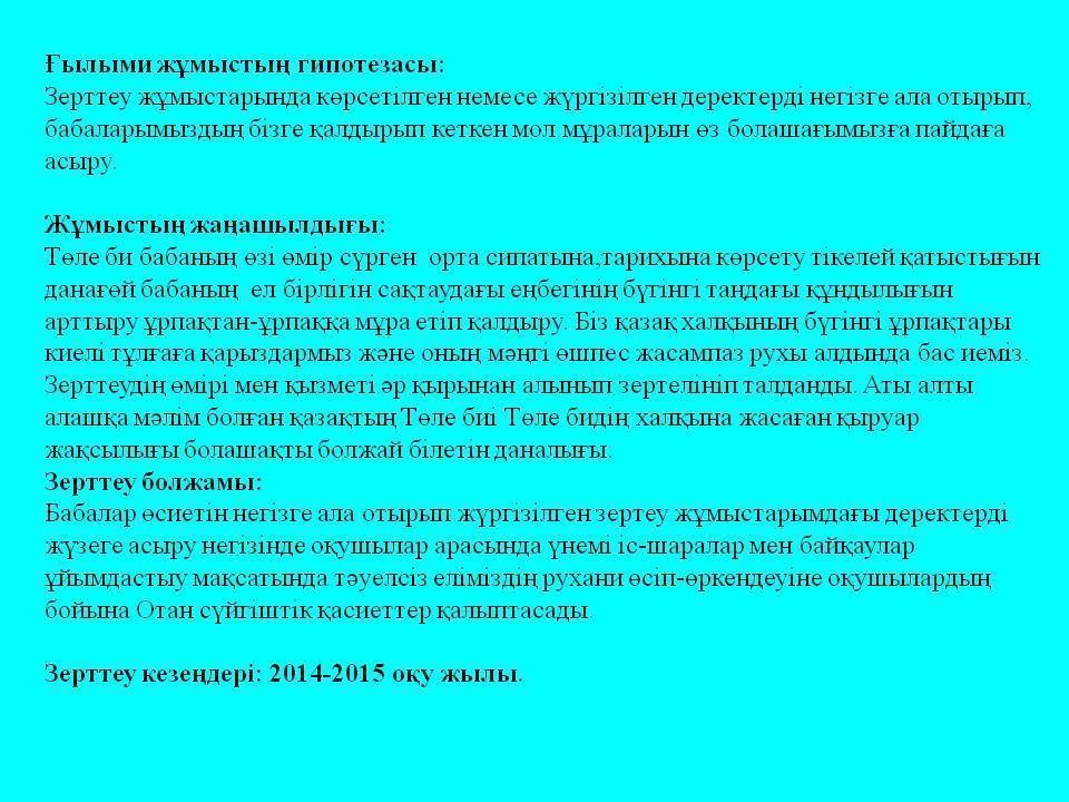 15 сентябрь 2016 100 1 2 3 4 5 Төле би мұраты – ұрпаққа байлық Ғылыми жоба тақырыбы:Төле би мұраты – ұрпаққа байлық