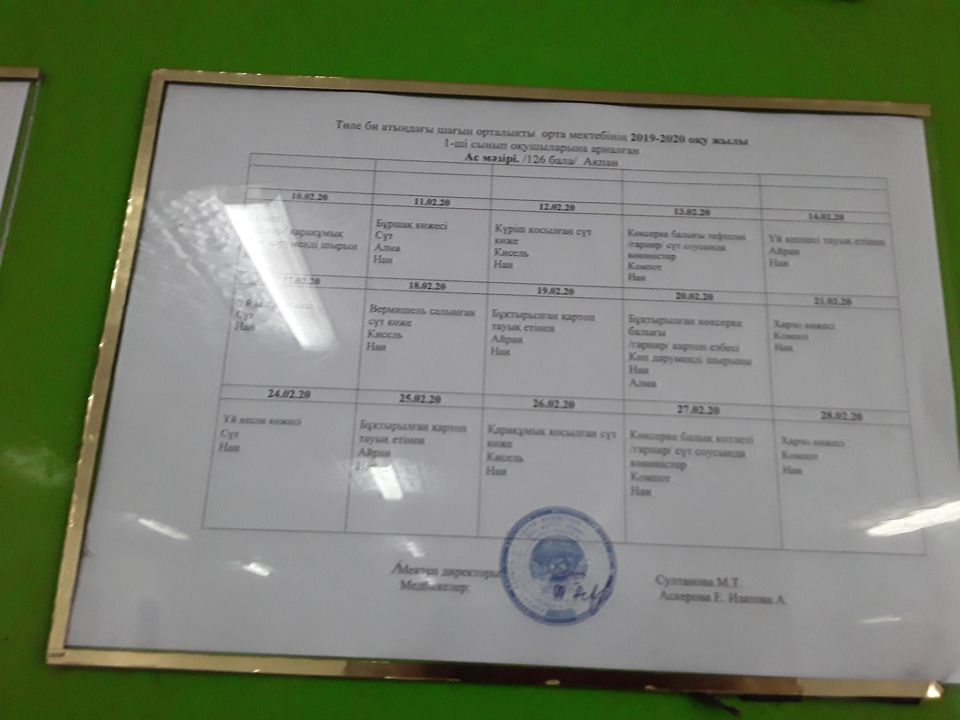 ҚР білім және ғылым министрінің 2015 жылғы 13 сәуіріндегі №198 бұйырығының №5 қосымша жаңа редакциядағы ҚР білім және ғылым министрінің 13.12.2018 жылғы № 684 бұйырығына сәйкес,Шуауданы әкімдігінің білім бөлімінің 2019 жылғы 9 қыркүйектегі № 499 бұйырығы негізінде,Төле би/а/ атындағы шағын орталықты орта мектебі 2019-2020 оқу жылы аз қамтылған отбасынан шыққан оқушылардың ыстық тамақпен қамтылуы туралы.