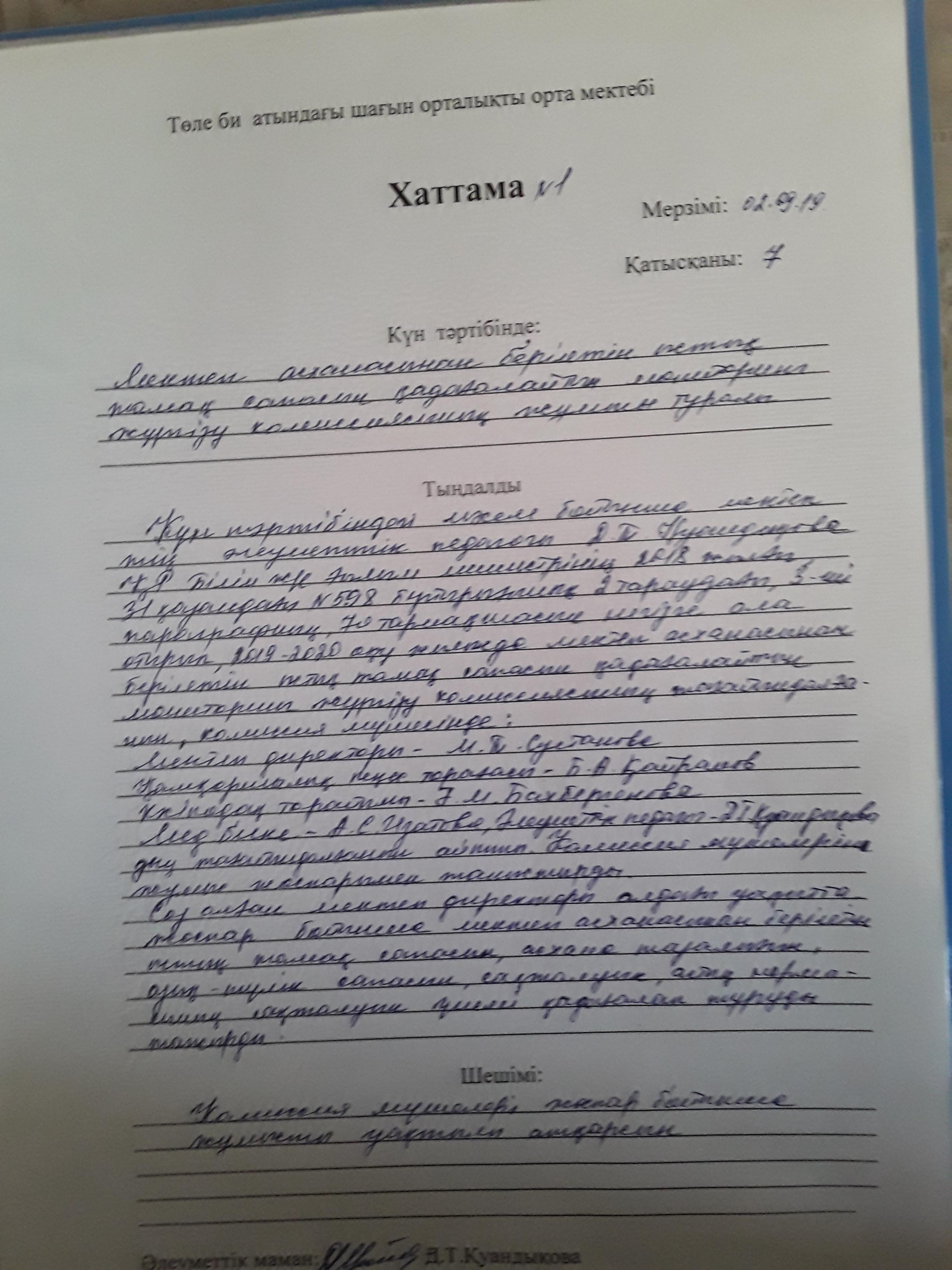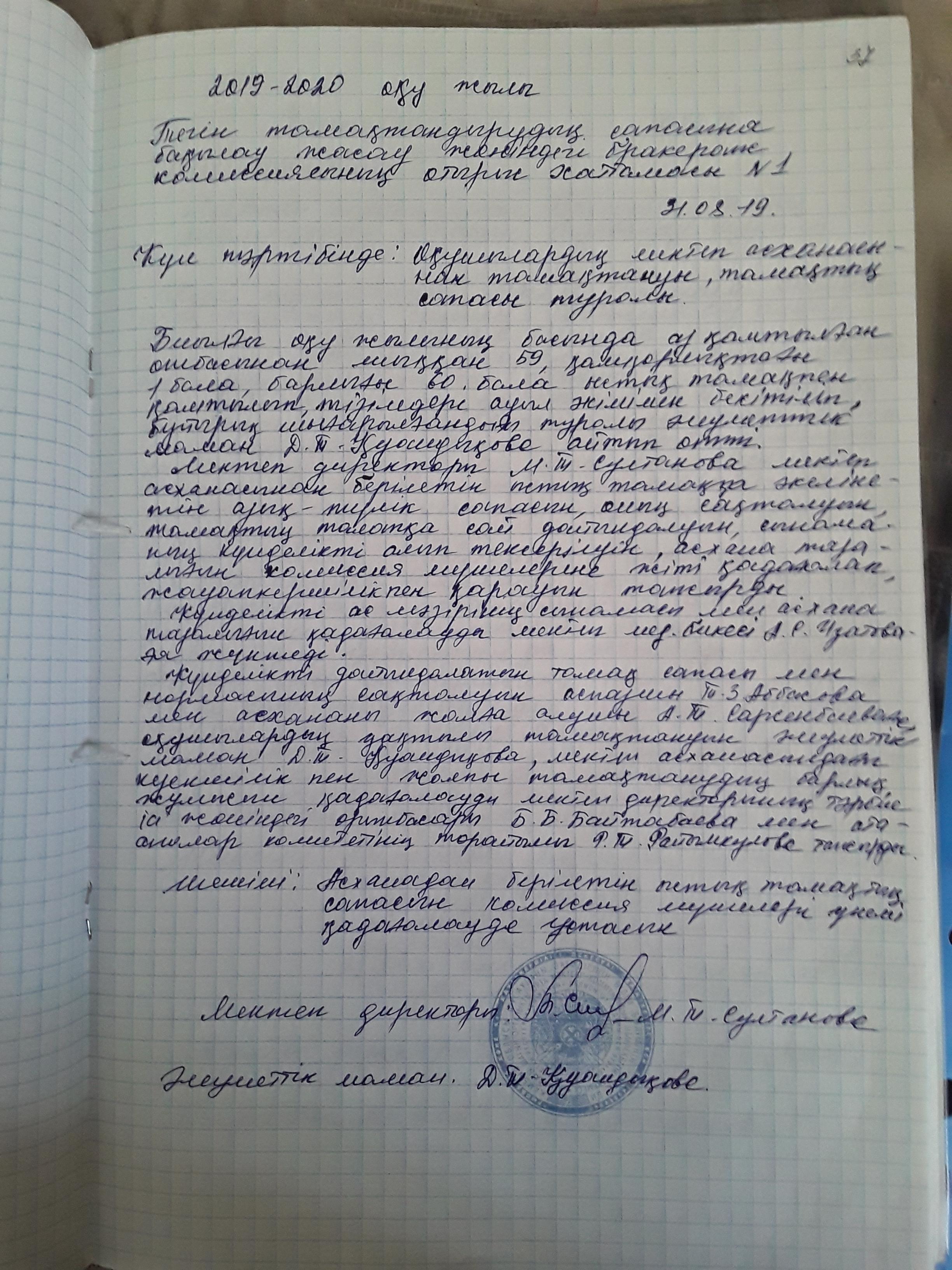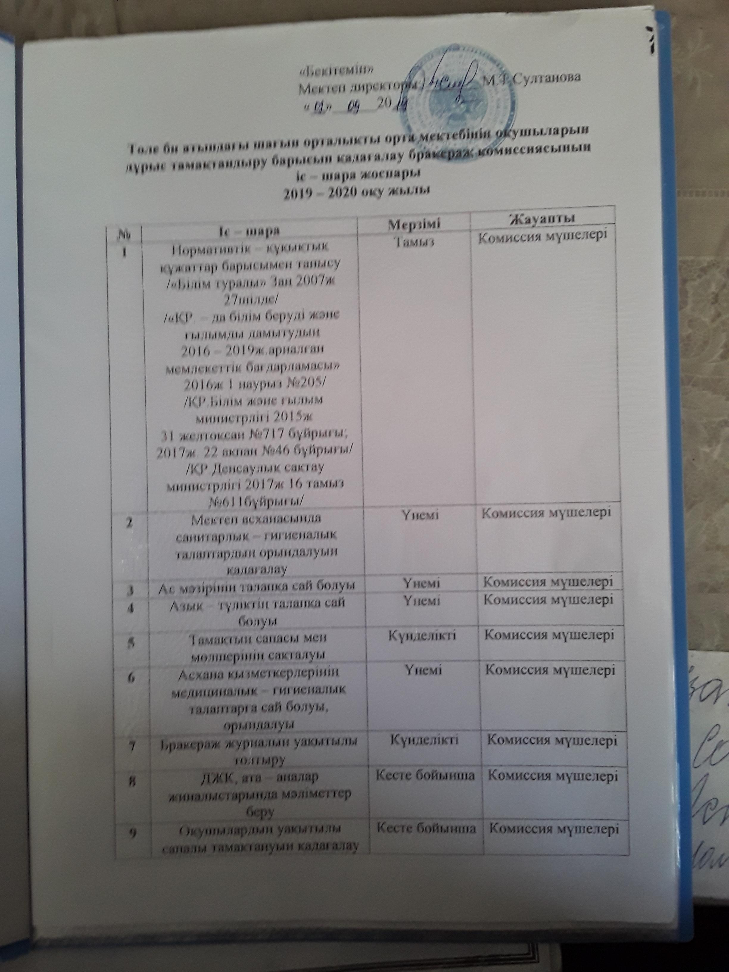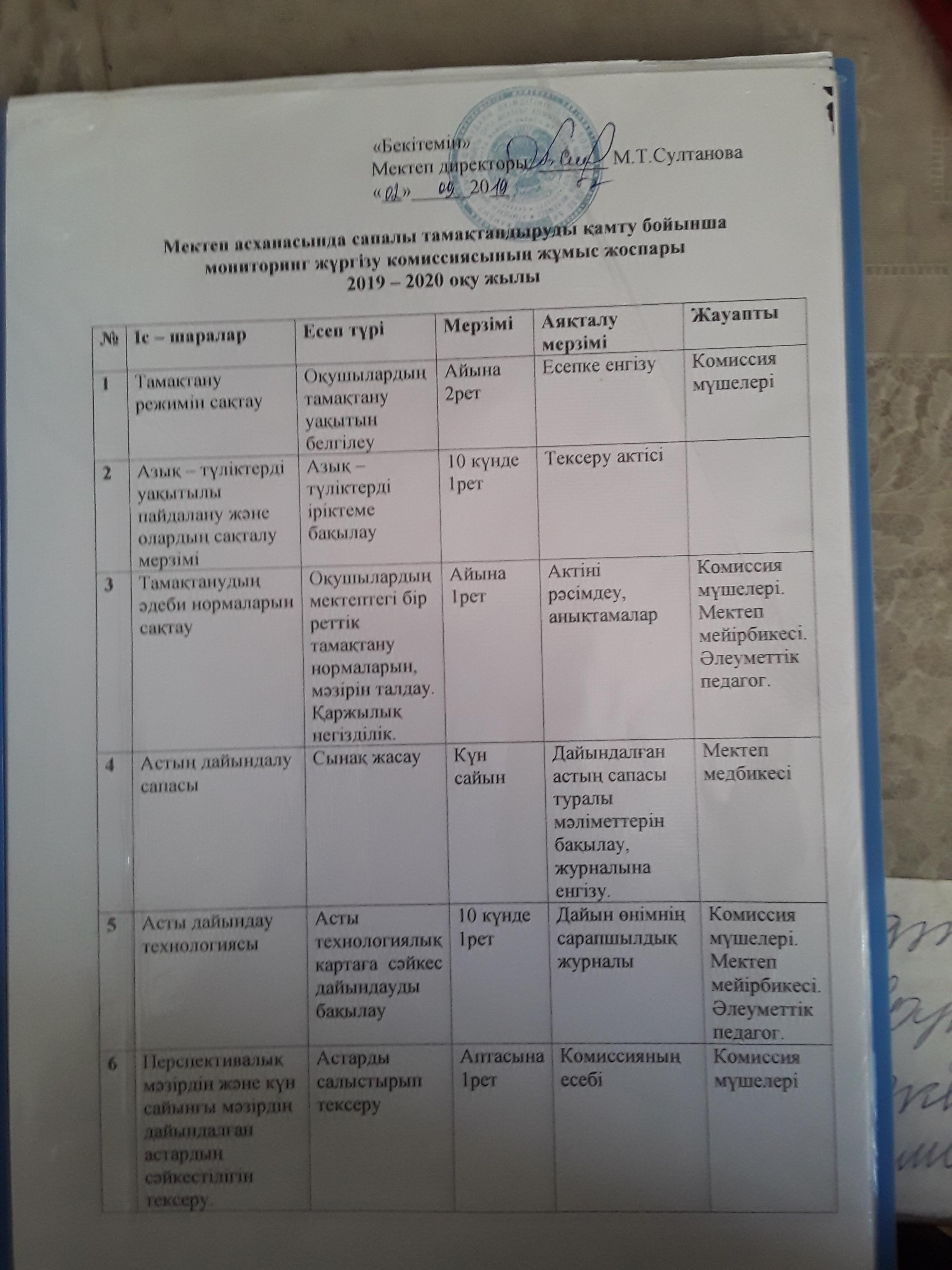 Әкелінетін азық-түліктің сапасының талапқа сай екендігі комиссия мүшелерінің қатысуымен апта сайын қабылданып ,қабылдау актсі толтырылады. Асхананың жабдықталуы, ас сақтайтын қоймалар, тоңазытқыштардағы сақталатын азық-түліктің көршілестігі қадағаланып, тамақ сапасын бақылайтын бракераж комиссия мүшелері тамақ сапасын күнделікті тексеріп,сынамалар алынып хаттамалар толтырылады. Аудандық білім бөлімінен де жіті қадағалап тұрады.